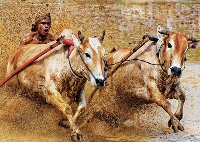 В гонках участвует около 500-700 быков. Наездники управляют свободной упряжкой из двух животных, стоя босиком на маленькой деревянной подставке.