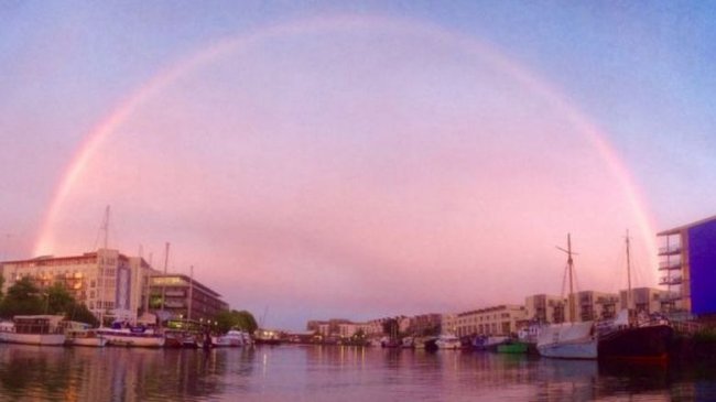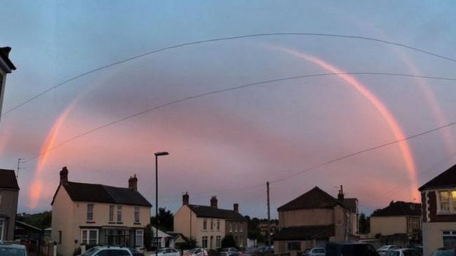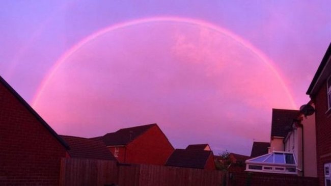 В небе над этими населенными пунктами Англии появилась то ли радуга, то ли какое-то космическое явление, и этот таинственный розовый полукруг приковал внимание миллионов британцев, вышедших на улицу полюбоваться удивительным природным явлением.