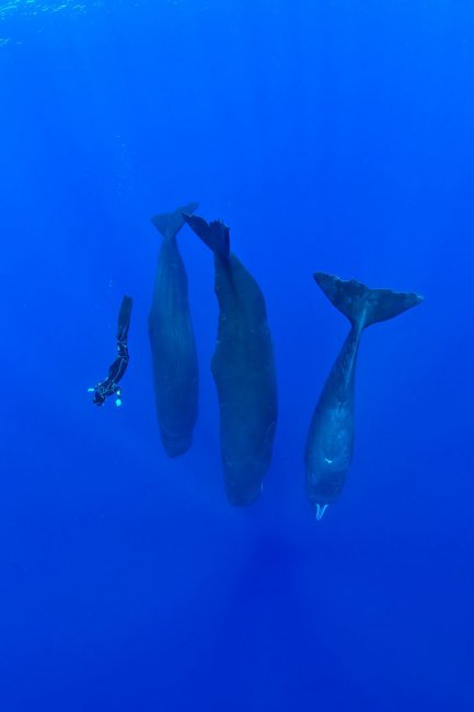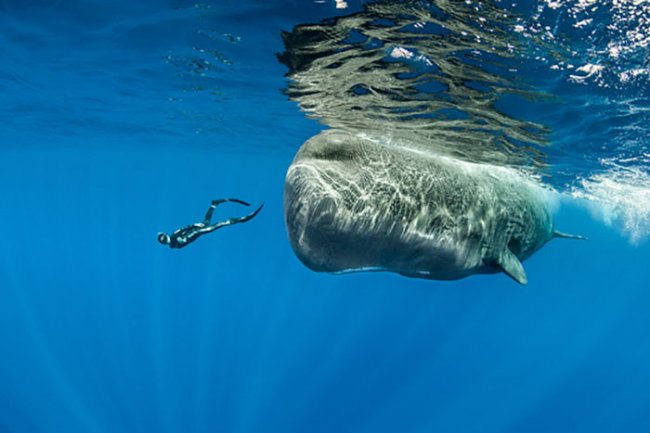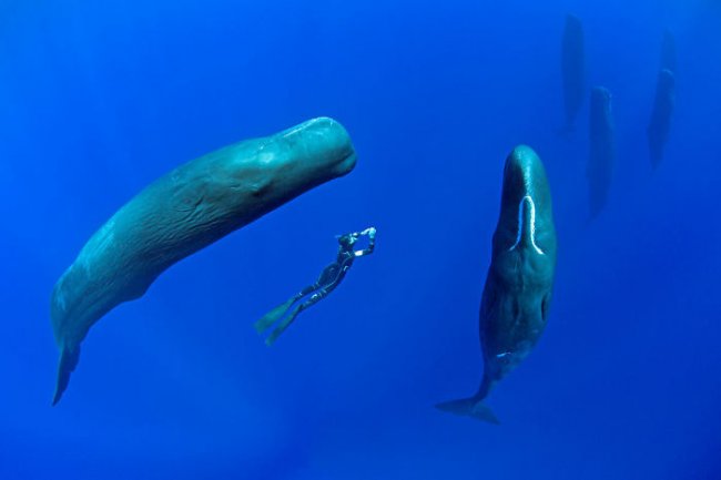 Аквалангисткой-моделью, которую фотограф снимал рядом со спящими кашалотами, стала дайвер Сабрина Беллони.