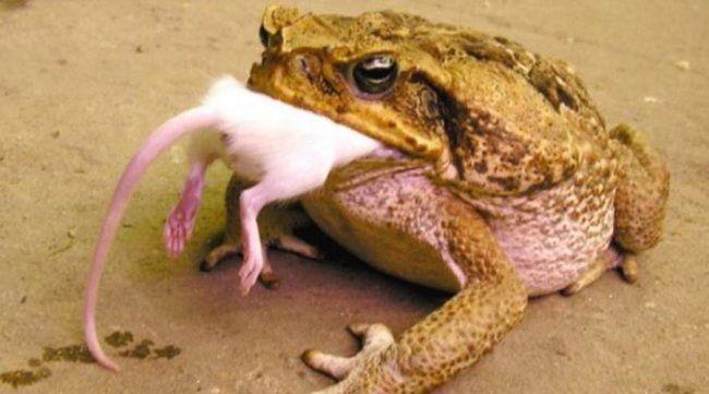 Тростниковая жаба при сравнительно небольших размерах (ага вырастает до 25 сантиметров) весит целых полтора килограмма. Когда-то англичане решили завести жабу в Австралию, чтобы хоть как-то спастись от местных насекомых. Уже на месте выяснилось, что ага токсична и представляет серьезную угрозу для животных и маленьких детей.