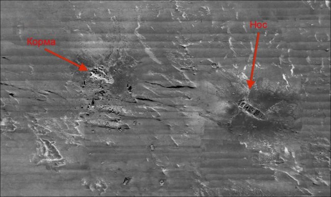 около 4 км. Судно в процессе погружения под воду треснуло и сейчас две его части лежат на дне, на расстоянии около 600 метров одна от другой. В радиусе нескольких сотен метров возле них находятся множественные обломки и предметы, в их числе огромный кусок корпуса судна.