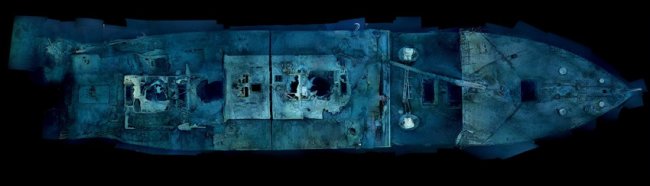 Панораму носовой части Титаника, исследователям удалось сделать путем обработки нескольких сотен снимков. Если рассматривать ее справа налево можно увидеть лебедку от запасного якоря, которая торчит прямо над носовой