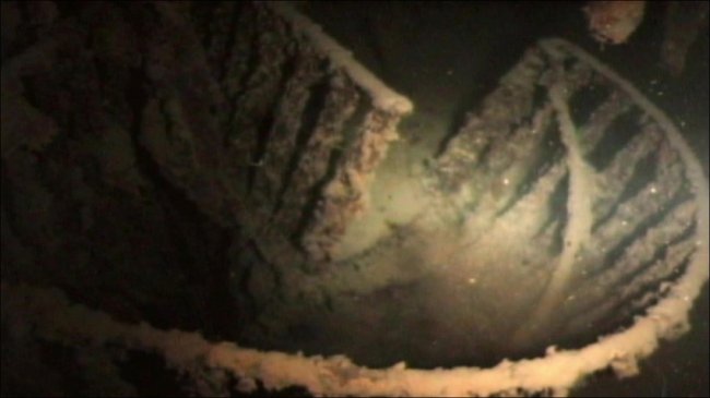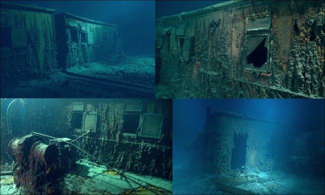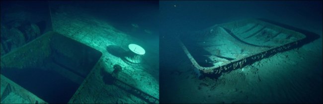 Передняя часть палубы и часть надстройки, которая сохранилась после крушения. На фото внизу справа можно рассмотреть вход на лестницу отсека 1-го класса.