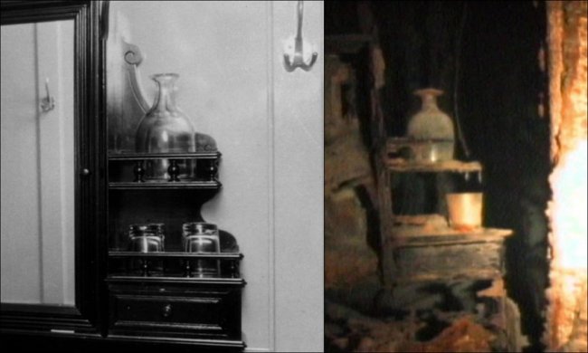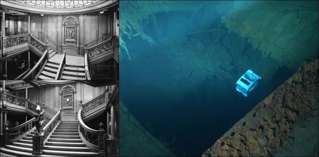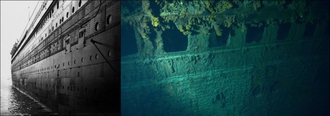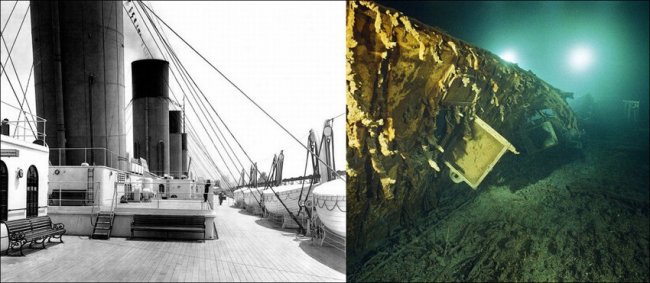 Сравнительные фото палубы Титаника, на которой размещались спасательные шлюпки. Справа видно, что надстройка на ней местами разорвана.