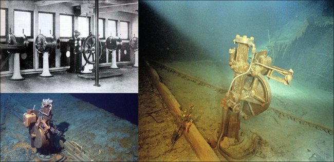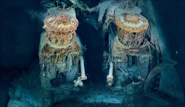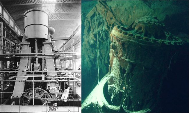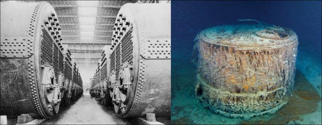 Когда судно разломалось, на дне оказались и паровые котлы, ведь машинное отделение как раз попало в точку разлома. Фото поршневого устройства: