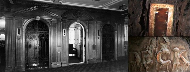 За лестницей были оборудованы лифты для пассажиров 1-го класса. О них напоминают только отдельные элементы. Надпись, которую можно увидеть на фото справа, находилась напротив лифтов и указывала на палубу. Именно эта надпись – указатель, направляющий на палубу А (буква А, сделанная из бронзы, отпала, но следы еще остались).
