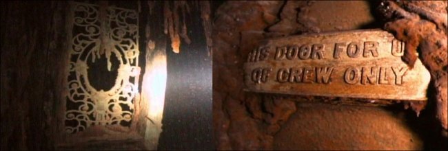 Еще остатки роскоши. Сохранилась дверь, которая вела в ресторан, расположенный на палубе D, а также табличка, указывающая на служебные двери.
