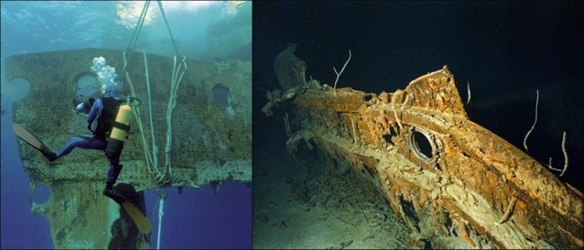 Кормовая часть судна в сравнении, с хорошо сохранившейся носовой, просто груда бесформенного метала. Фото правого борта:
