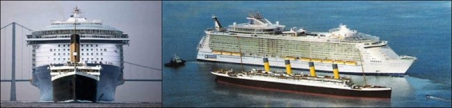 Именно так бы смотрелся «Титаник» вместе с самым большим современным пассажирским лайнером, который носит название «Allure of the Seas».