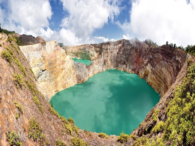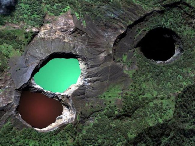 На острове Флорес есть три необычных кратерных озера, вода в которых меняется со временем оттенок. Причина невиданного явления до сих пор не известна ученым. Давным –давно образовались три впадины в результате извержения вулканов, которые позже превратились в волшебные озера.