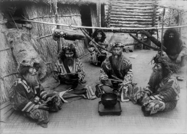 Шесть айнов в традиционных нарядах сидят у чаши.