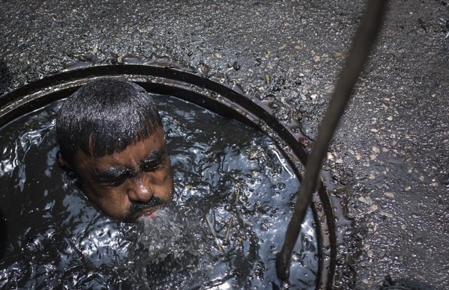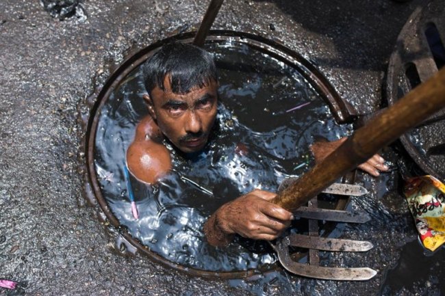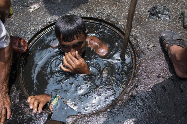 14-миллионный город постоянно страдает от сильных наводнений, вызванных проливными дождями. Чистильщику приходиться нырять в мутную зловонную жижу канализации без какой-либо защиты, чтобы практически голыми руками разобрать завалы внутри. Платят за это грязное дело около $380 в месяц.