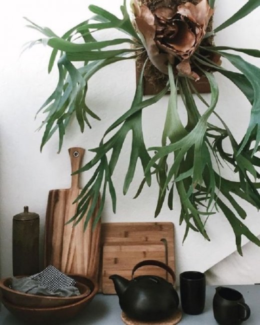Оригинальный папоротник с оленьими рогами растет на дереве или в вертикальном положении.