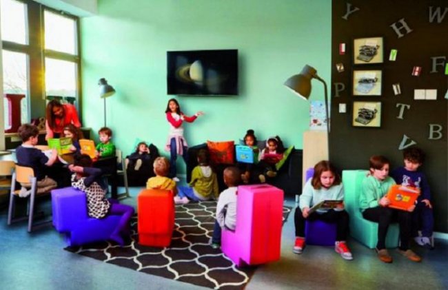 Вместо традиционной библиотеки в этом оригинальном детском саду используются «образовательные коридоры», в которых есть специальные пространства для показа презентаций по образовательной программе. Здесь также есть места для тихого обучения и небольших групповых проектов. Везде есть доступ к беспроводному интернету. Такая организация помогает сотрудничать детям и преподавателям, обеспечивая образование на интердисциплинарном уровне. Современное оснащение коридоров поднимает обучающий процесс на новый, более продвинутый уровень.