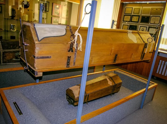 В Вене же во избежание ужасных случайностей стали использовать «сигнализацию». Устройство состояло из шнура, присоединенного к колокольчику. Шнур вкладывался в руку покойника, который в случае погребения заживо мог дернуть за шнур, чтобы смотритель кладбища услышал звон и спас его от уже настоящей гибели. В музее представлена целая коллекция разных спасательных механизмов с колокольчиками и звонками.