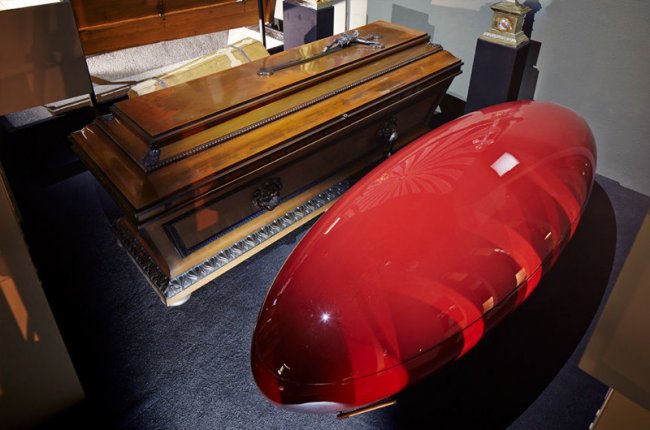Еще один экспонат музея, который также можно приобрести для себя, — гроб в форме кокона. Его создателем стал немецкий дизайнерский дом UONO. Производители уверены, что необычная форма гроба внушит клиенту спокойствие, чувство безопасности и защищенности. «Кокон» создан из джута и покрыт эмалью на водной основе. Производители уверяют, что такие материалы разлагаются в земле в среднем за 10–15 лет без ущерба для окружающей среды. Пожалуй, единственный минус этого девайса от кутюр — его цена: €3000.