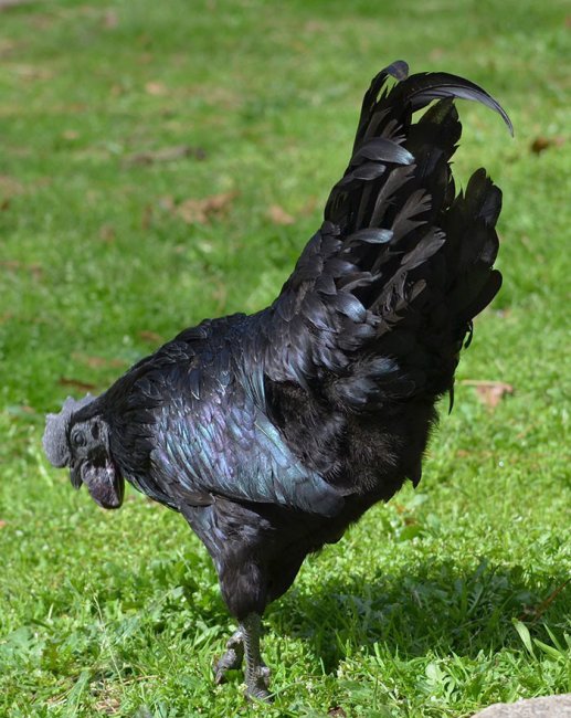 Эта необычная птица обитает в Индонезии. Особенна она тем, что на 100% черная. Черное у нее все: перья, клюв, ноги, когти, язык, гребень, сережки. Даже ее мясо – и то черное. Ученые говорят, что это следствие генетической мутации.