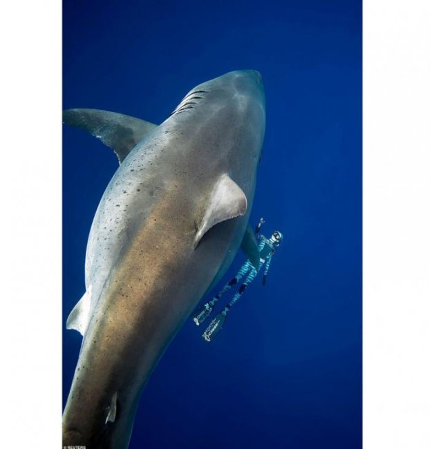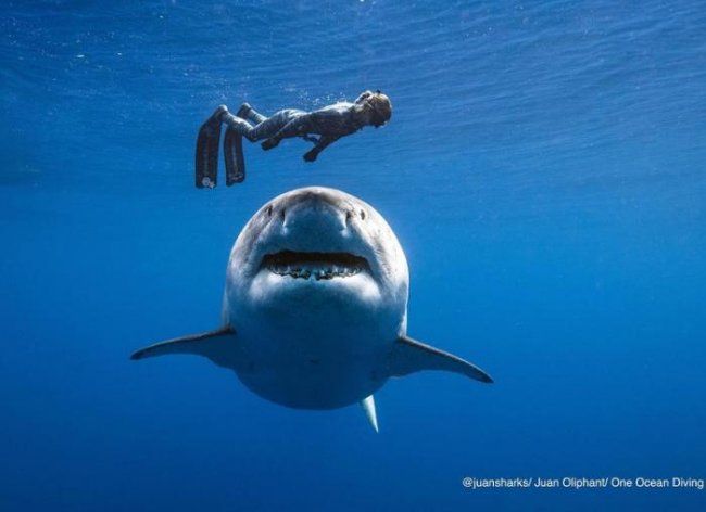 «Я до сих пор в шоке от плавания рядом с этими удивительными созданиями» — рассказывает восхищенный Олифант, — «Я был лицом к лицу с крупнейшей заснятой вблизи белой акулой!».