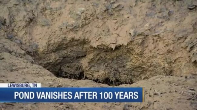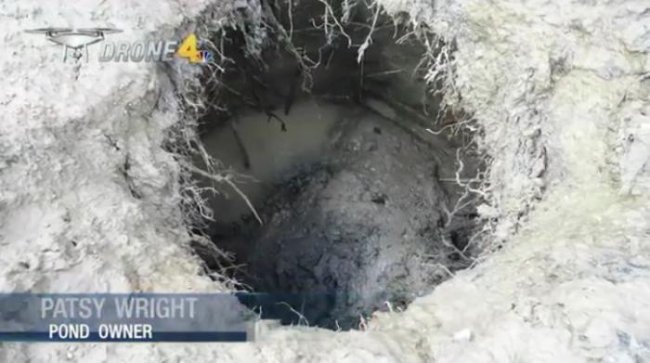 Дыра, оставшаяся в дне пруда после падения в него неопознанного объекта, в глубину составляет всего несколько футов и на дне ее не видно ничего кроме небольшой лужицы воды и грязи.