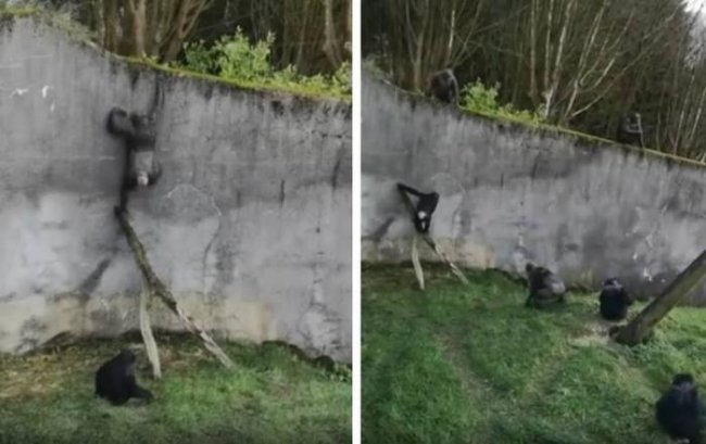 Сначала их удивило, что на верху большой бетонной стены, огораживающей вольер с шимпанзе, уже сидит один примат, а потом они увидели как второй шимпанзе, используя умело прислоненную к стене ветку дерева, забрался по ней на ту же стену.