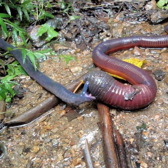 Некоторые червяги достигают в длину более метра, но индийская червяга совсем невелика, всего около 10 см. Живет она в верхних слоях почвы как и дождевые черви, но у нее множество мелких и острых зубов, что намекает на то, что это хищник.