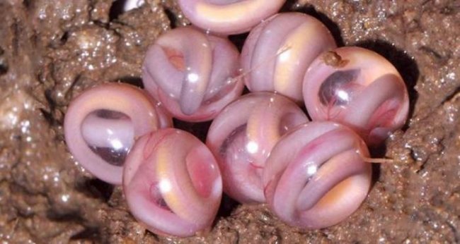Когда они почти готовы к вылуплению, их тела отлично видны через прозрачную оболочку яйца и тогда вся кладка яиц становится похожей на что-то инопланетное из фильма ужасов. Тем более, что детеныши активно двигаются внутри яйца.