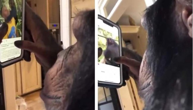 Примат при этом не просто крутит гаджет в руках, он осознанно понимает, что делает, аккуратно прокручивая пальцем список медиафайлов и зная как переключать режимы и увеличить отдельный снимок.