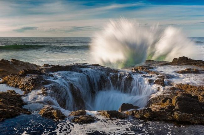 Данное творение природы, расположившееся на мысе Перпетуа в центральной части побережья штата Орегон, представляет собой каменную воронку глубиной несколько метров, которая во время приливов, отливов или штормовых ветров, когда водную гладь рассекают бушующие волны, превращается в настоящий фонтан, взрывающийся миллионами соленых брызг.