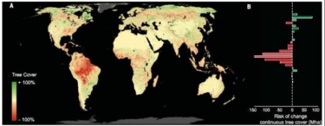 Красным цветом показано, сколько лесов может исчезнуть из-за потепления