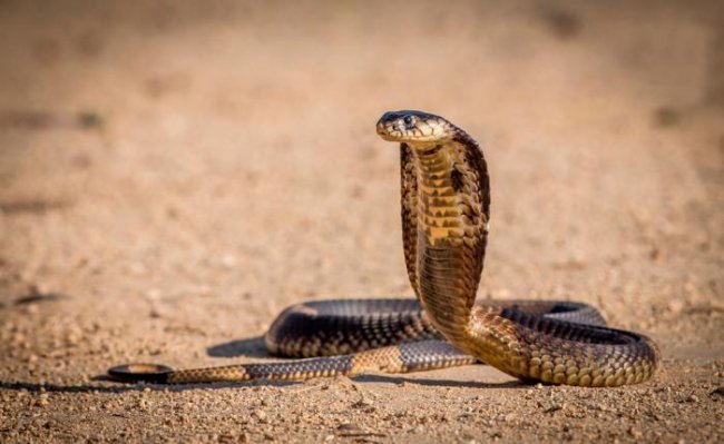 А это — самая крупная из отряда ядовитых змей. Средняя длина королевской кобры — около 4 метров, рекордсмен же достигал пяти с половиной метров.