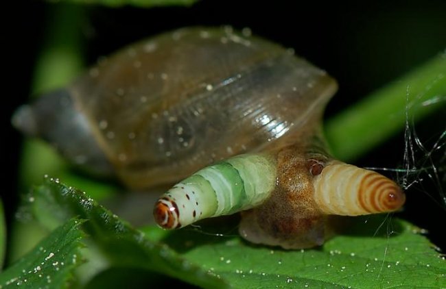 Паразитический червь-сосальщик использует двух животных в качестве хозяев. Первым носителем являются улитки. Они съедают яйцо паразита, и в ее теле начинает развиваться мешок с насекомыми – спороциста. Мешок растет, на нем вырастают специальные отростки, проникающие в усики улитки. Они пульсируют и извиваются, а улитка, живущая в тени, выползает на солнце, где у нее увеличиваются шансы быть съеденной воробьем.