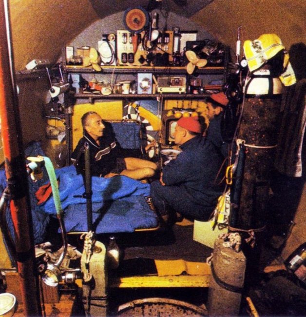 В отличие от «Морской звезды», здесь был скорее не дом, а карцер: крайне мало места, постоянная духота и высокое давление, экспериментальная смесь гелия, азота и кислорода вместо воздуха, тьма и акулы вокруг. В общем, все, чтобы проверить себя в настоящей стрессовой ситуации. Единственное, что радовало двух добровольцев, которые прожили здесь неделю — гелий в смеси делал их голоса писклявыми и смешными и члены команды часто звонили в «Ракету» просто чтобы поболтать и от души похохотать всем вместе.