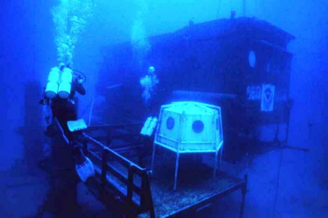 Кроме этого, было и еще одно важное строение. Несмотря на свою аскетичность, «Ракета» была в чем-то даже более интересна с точки зрения всего проекта. Эта башенка располагалась на глубине 30 метров и была сделана для того, чтобы выяснить, как именно аквалангисты перенесут крайне тяжелые условия подводной работы и жизни.