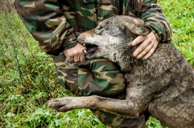Признаком уверенности животного в собственных намерениях — есть его рычание. Стоит быть внимательному к движению волка. Если он придавливает уши, это показывает его готовность к прыжку. И тут Вам уже понадобится смелость и сила в руках. Когда животное нападет, надо схватить его за глотку, прижать плечом и давить.