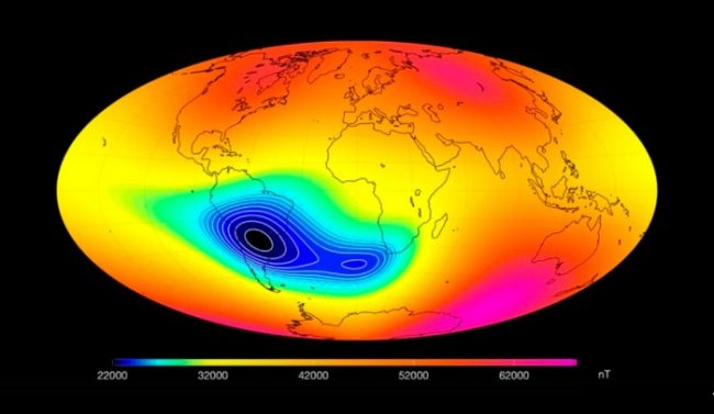 Магнитное поле нашей планеты продолжает ослабевать, и наибольший спад наблюдается в области между Африкой и Южной Америкой.