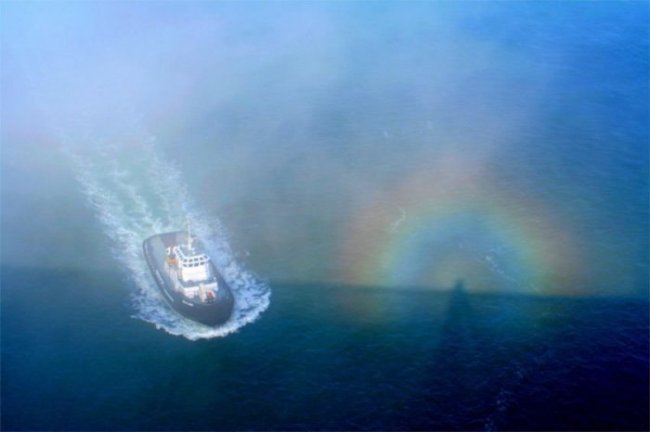 «Туманная» радуга. Туманный ореол похож на бесцветную радугу. Туман, рождающий этот ореол, состоит из более мелких частиц воды, и свет, преломляясь в крошечных капельках, не расцвечивает его.