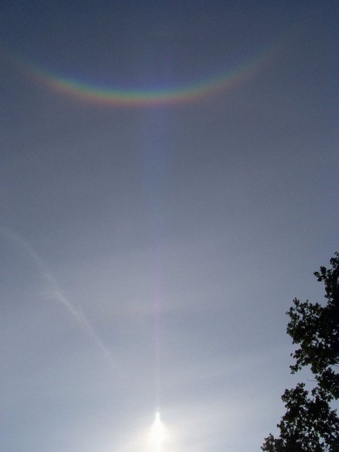 Околозенитная дуга. Дуга с центром в точке зенита, расположенная выше Солнца приблизительно на 46°. Она видна редко и только в течение нескольких минут, имеет яркие цвета, чёткие очертания и всегда параллельна горизонту. Стороннему наблюдателю она напомнит улыбку Чеширского Кота или перевёрнутую радугу.