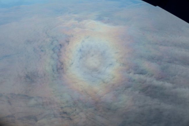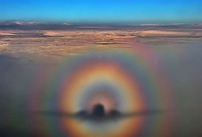 Свет Будды. Явление схоже с Призраком Броккена. Солнечные лучи отражаются от атмосферных капелек воды над морем и тень самолёта посреди радужного круга…