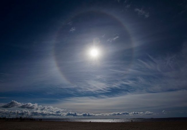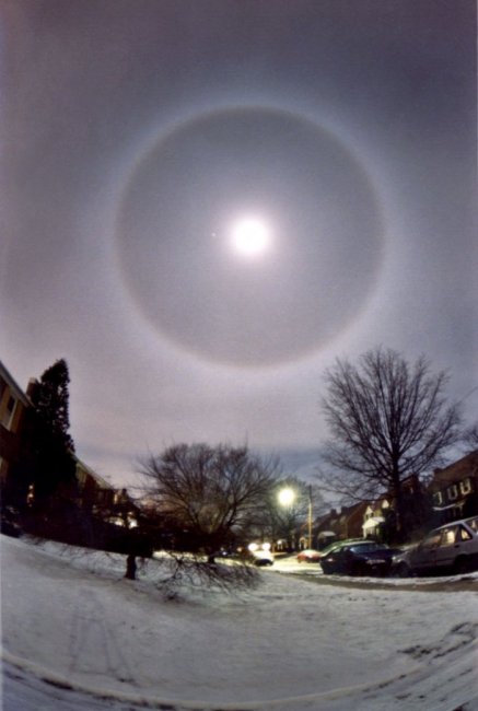 Гало в 22?. Белые световые окружности вокруг Солнца или Луны, которые возникают в результате преломления или отражения света находящимися в атмосфере кристаллами льда или снега, называются гало. В холодное время года гало, образованные кристаллами льда и снега на поверхности земли, отражают солнечный свет и рассеивают его в разных направлениях, образуя эффект под названием «бриллиантовая пыль».