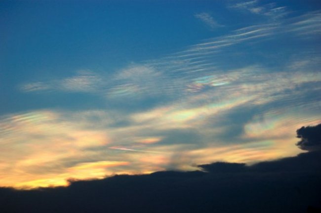 Радужные облака. Когда Солнце располагается под определённым углом к капелькам воды, из которых состоит облако, эти капли преломляют солнечный свет и создают необычный эффект «радужного облака», окрашивая его во все цвета радуги.