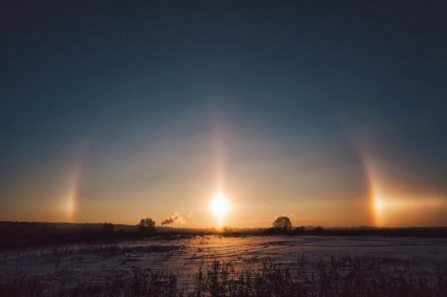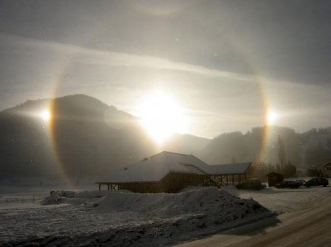 Ложное Солнце. Научное объяснение такое: «По мере того как вода замерзает в верхних слоях атмосферы, создаёт маленькие, плоские, шестиугольные ледяные кристаллы льда. Плоскости этих кристаллов, кружась, постепенно опускаются на землю, основную часть времени ориентированы параллельно поверхности.»