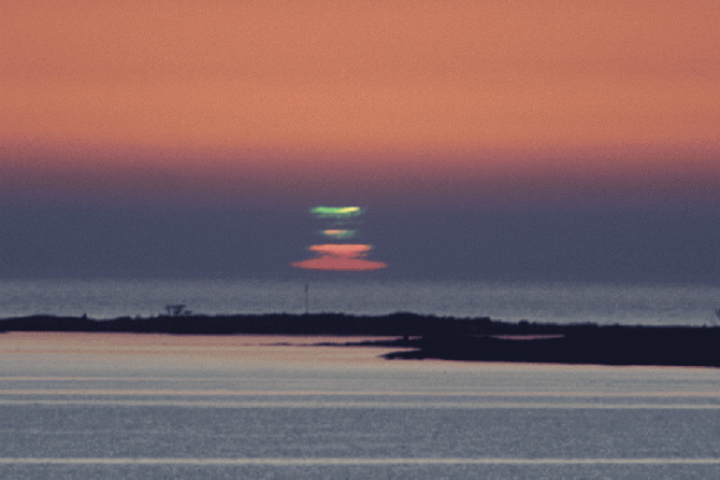 Зелёный луч. «Когда заходящее Солнце полностью скрывается из виду, последний проблеск выглядит поразительно зелёным. Эффект можно наблюдать только из мест, где горизонт низок и далёк. Он продолжается всего несколько секунд.»