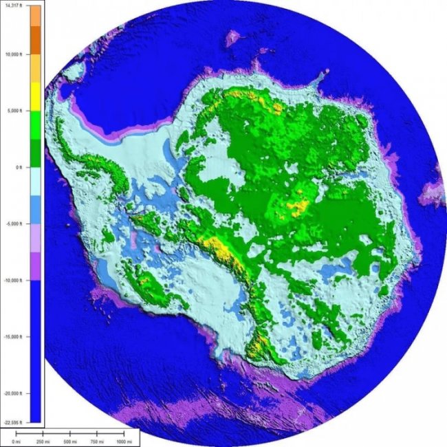 На самом деле, под 2,5-5 км льда находится материк, который на 60% погружён под воду, здесь есть настоящие горные цепи, вулканы, а ещё кратер диаметром почти 490 км. Самая высокая часть — гора Винсон, соизмерима Эльбрусу.