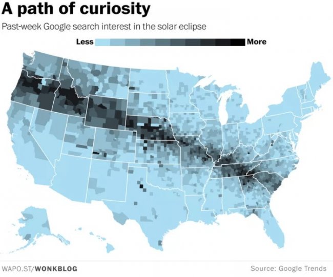 Необычный эксперимент провёл Гугл. Данная чёрная полоса — это количество поисковых запросов на тему солнечного затмения. Что? Всё достаточно просто, здесь имело место обратная логика. Там, где видели солнечное затмение, число запросов существенно росло, поэтому черная полоса практически в точности повторяет траекторию солнечного затмения.
