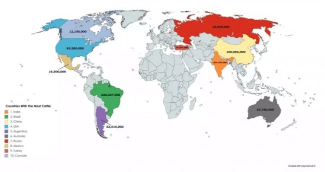 А вот Россия занимает 7 место, что меня, по правде говоря, удивило. Рогатый скот, как по мне, занимает немало места, и при широте российских территорий казалось, что мы должны быть в числе лидеров, но нет.