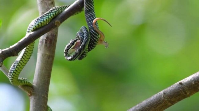 К сожалению, исследователи не поделились записанными видеороликами. Но я нашел отличную запись от канала National Geographic, где показан не только внешний вид райских украшенных змей, но и продемонстрирована техника их полета. Самое интересное начинается на двадцатой секунде, когда змея отталкивается от дерева и после непродолжительного свободного полета совершает посадку в совершенно другом месте.На тему необычных змей также советую прочитать материал от автора Hi-News.ru Ильи Хеля. Однажды он писал, что в американском штате Вирджиния нашли змею, у которой было две головы. Это очень редкое явление, но оно иногда действительно встречается и у ученых есть ему понятное объяснение.