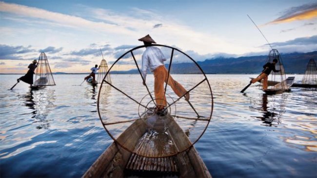 Рыбаки на рассвете. Техника рыбалки народ инта, живущего у озера Инле, со стороны напоминает необычную по почерку хореографию: в одной руке рыбаки держат сеть, а в другой — весло, которым они управляют ногой.