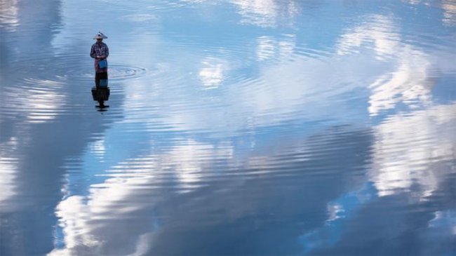 Женщина во время рыбалки. Однажды утром, прогуливаясь по знаменитому мосту У-Бэйн, построенному в 1849 году из тикового дерева, Дэвид заметил внизу женщину, которая ловила рыбу. В озере отражались облака, создавая иллюзию, что женщина ходит по небу.