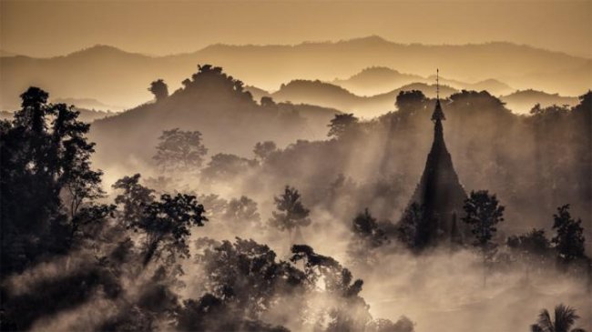 Вид с вершины горы в городе Мраук-У. Со всех сторон панорама с холма в древнем городе в штате Ракхайн на западе Мьянмы была окутана туманом и дымом. Это священное, уединенное место без толп туристов.