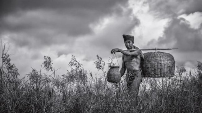 Ловец угрей рядом с озером Инле. В маленькой корзине рыбаки носят ловушку и червей, большая предназначена для улова.